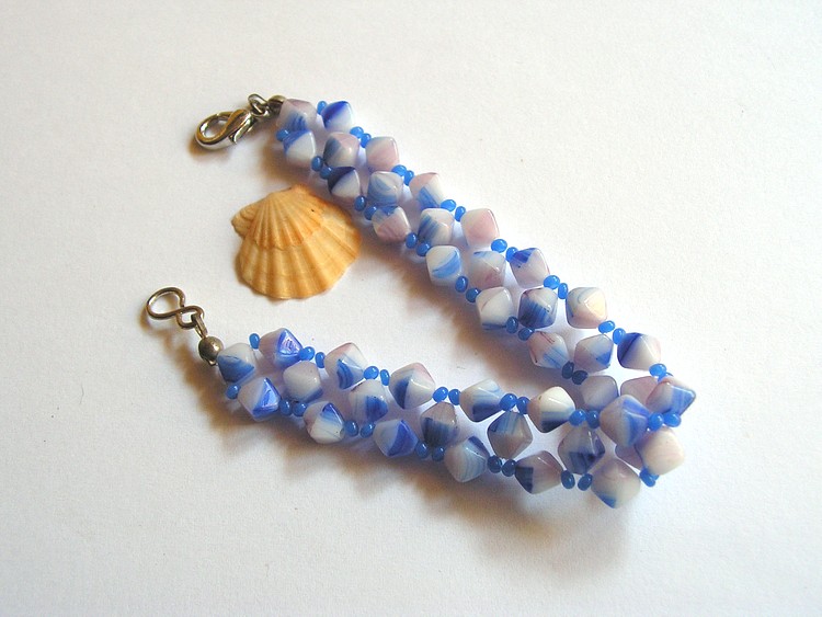 Náramek vyrobený ze skleněných korálků - pyramidek - a rokailu, navléknutých na vlasci. Délka náramku včetně zapínání je 18 cm, šířka náramku je 14 mm.
