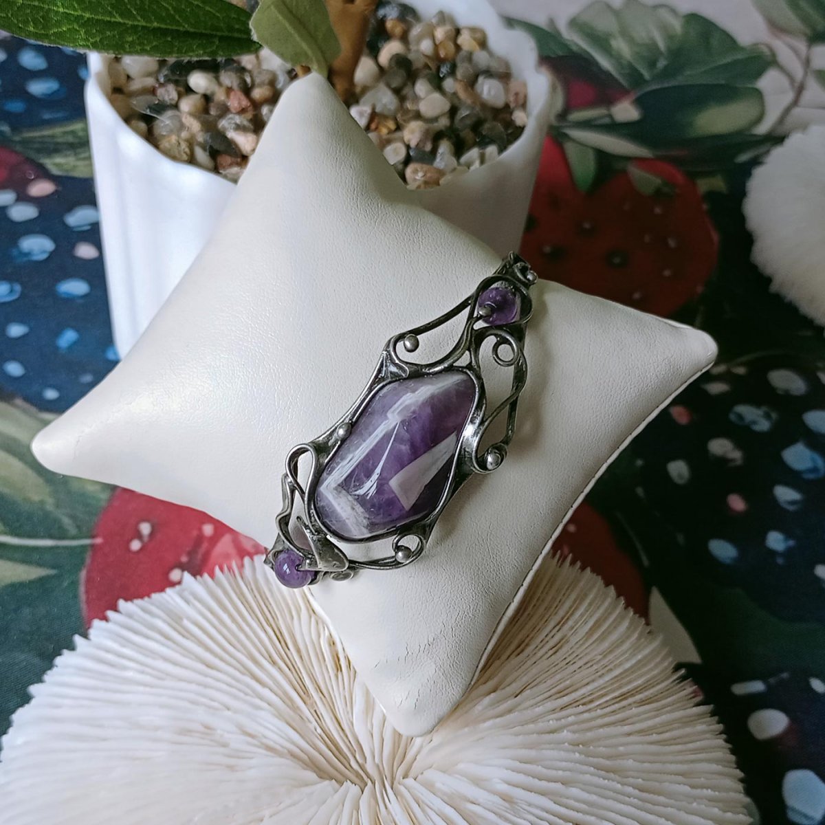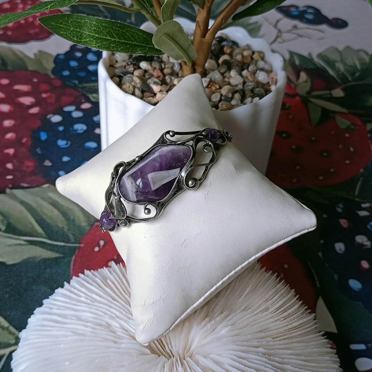 Autorský šperk zhotoven z bezolovnatého cínu se stříbrem, ametystů a drátu.