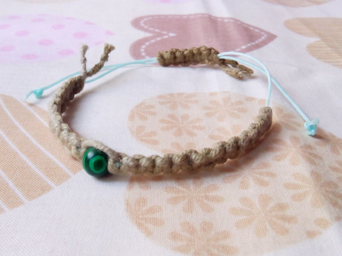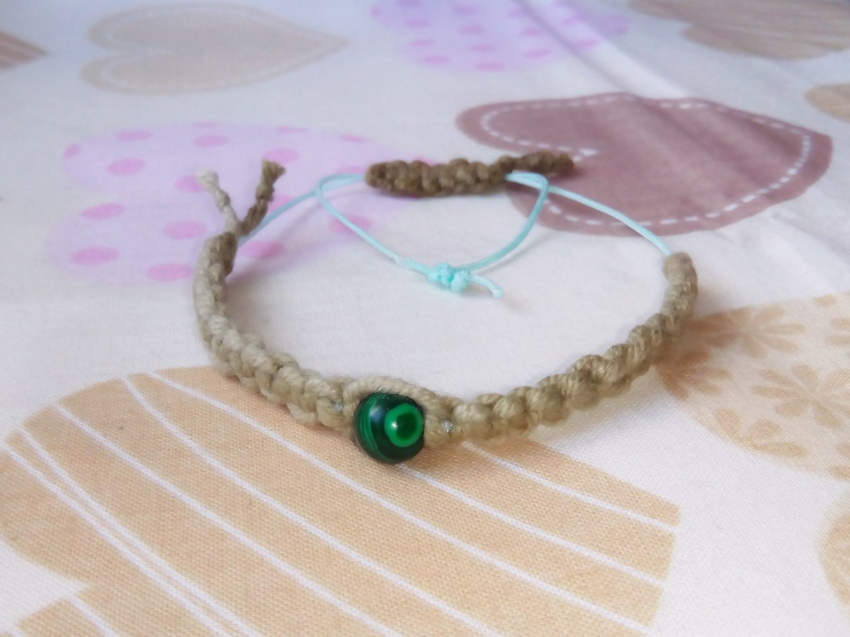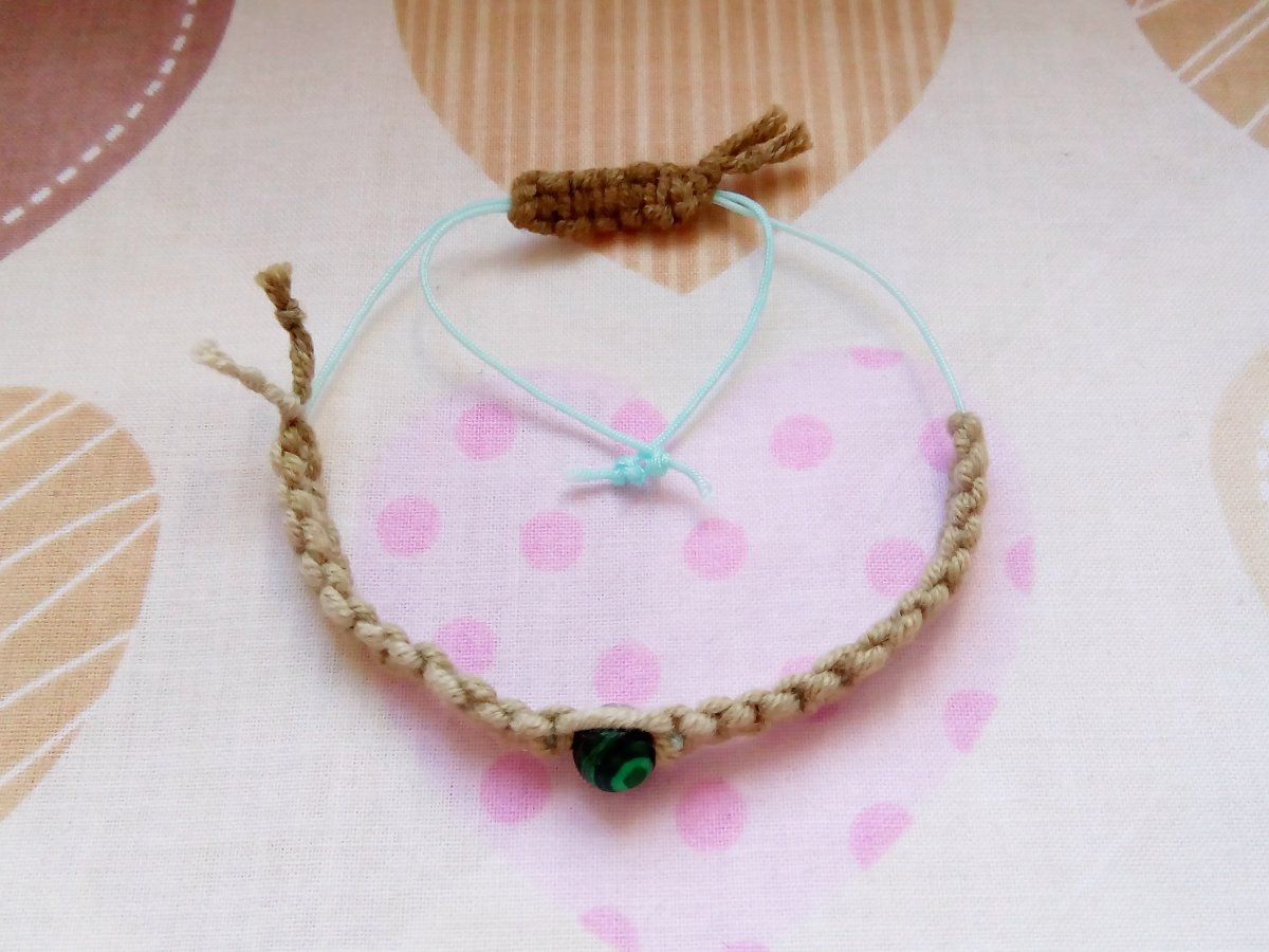 Nastavitelná velikost, zatahovací. Vyrobeno z textilních šňůrek s minerálním korálkem.