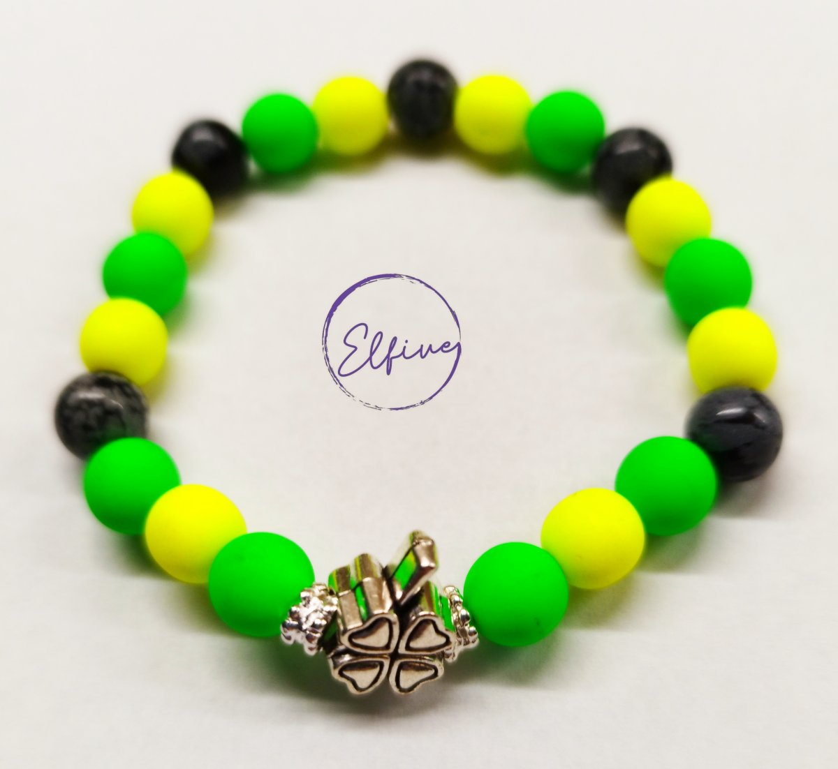 Náramek je vytvořen z fosforových korálků v barvách zelené a žluté a černých korálků s praskajícím efektem. Náramek je doplněn stříbrným přívěskem se čtyřlístkem.Náramek je vhodný pro zápěstí široké 17cm.