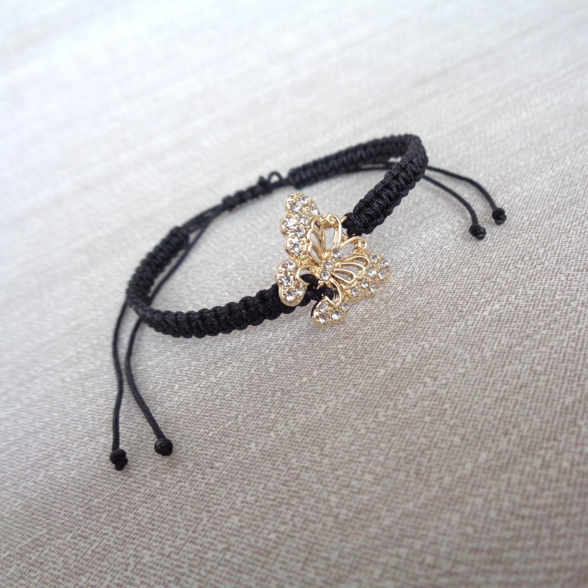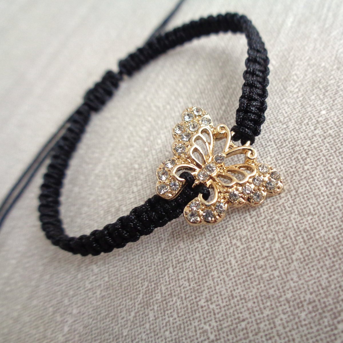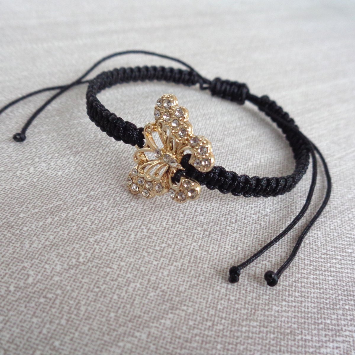 ... shamballa náramek z černé nylonové šňůrky a středového komponentu - motýlek ve zlaté s čirými štrasovými kamínky.