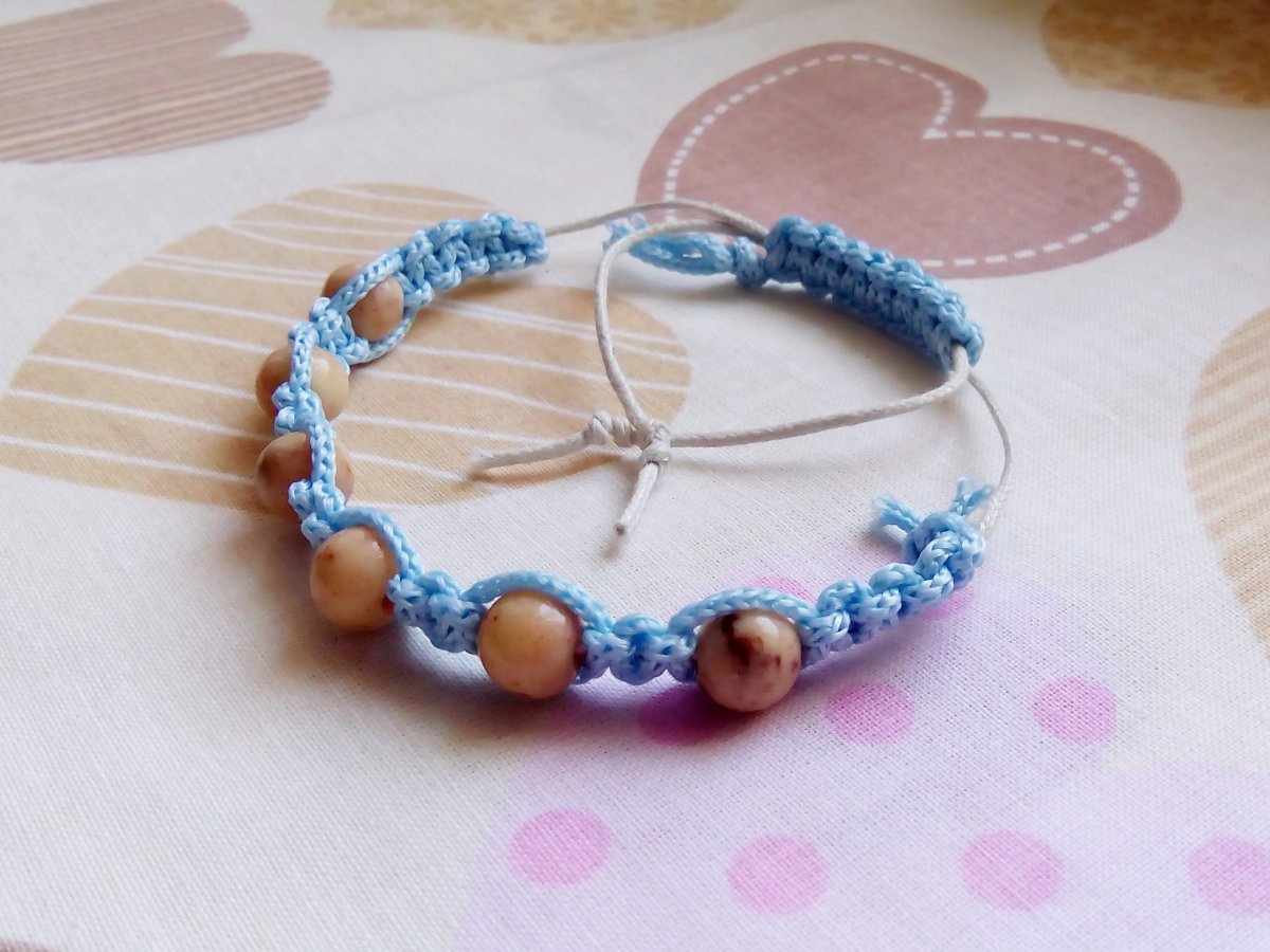 Nastavitelná velikost, zatahovací. Vyrobeno z textilní šňůrky s korálky.