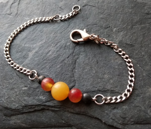 Náramek s minerály - žlutým topazem, šedými jaspisy a červenými jadeity. Řetízek je z chirurgické oceli. Délka náramku je 17 cm s možností prodloužení. Délku lze upravit podle přání.