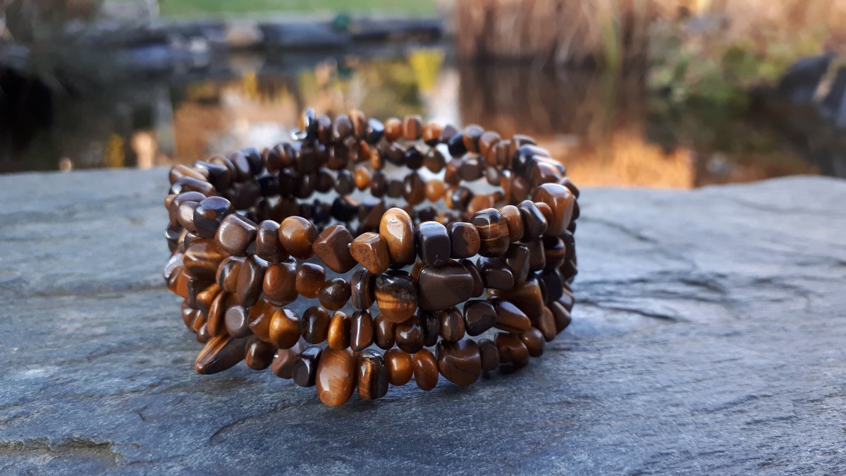 Náramek z minerálních zlomků tygřího oka, navlečených na paměťovém drátku o průměru 6cm /navléká se jemným omotáváním okolo zápěstí/.