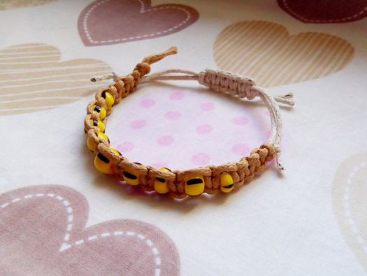 Nastavitelná velikost, zatahovací. Vyrobeno z textilních šňůrek s korálky.