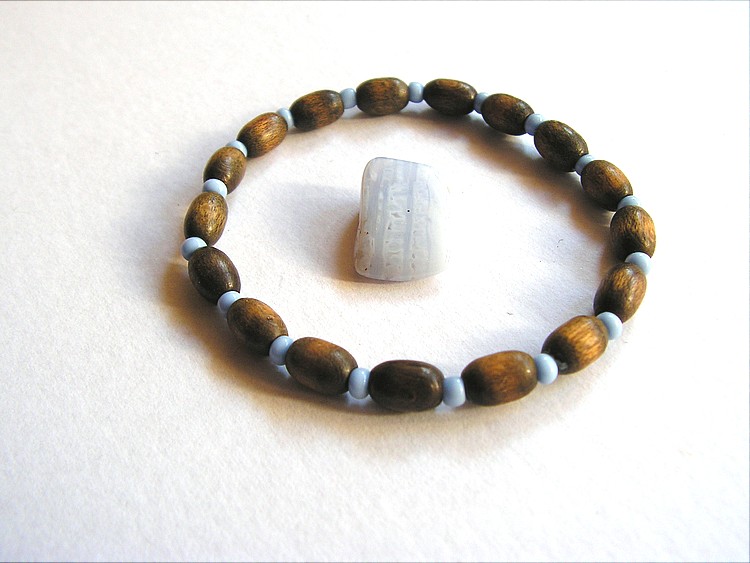 Náramek z dřevěných korálků a rokajlu na lycrové pružence. Obvod 17 cm.