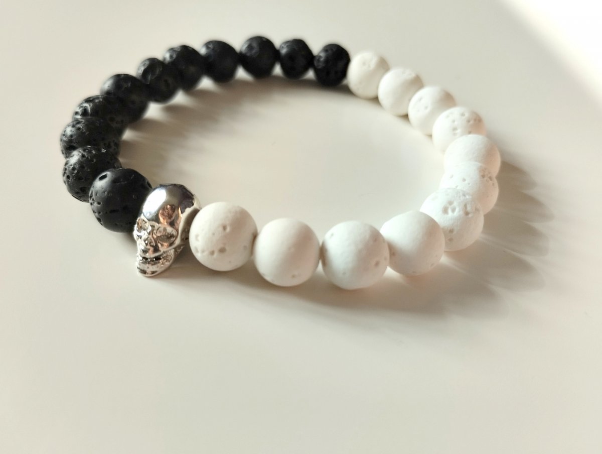 Náramek z minerálu láva bílá barvená 8mm+láva přírodní 8mm vnitřní obvod 16cm navlečený na pružence