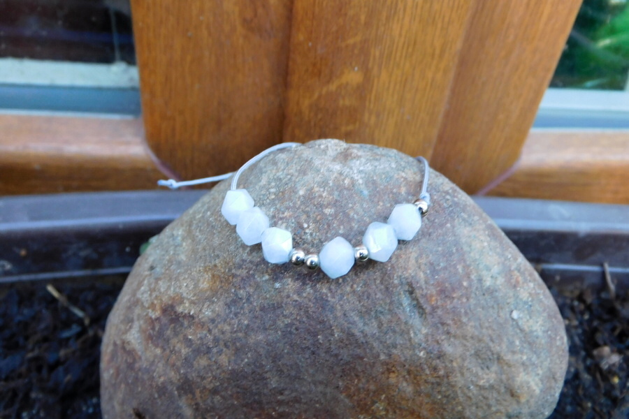 Jednoduchý, ale velmi moderní náramek vyrobený z malých světlunko modrých broušených akvamarinu a nerezových kuliček