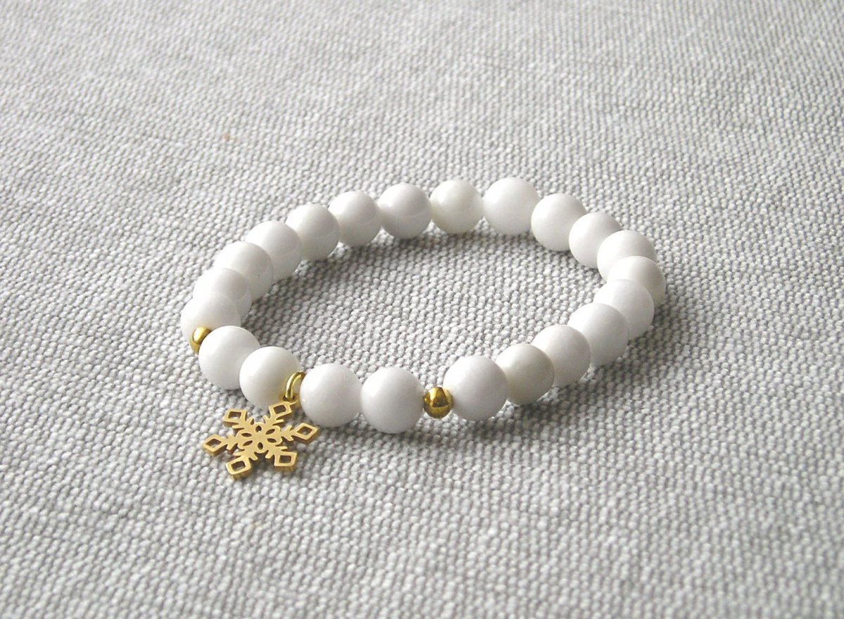 Náramek je vyroben z minerálu malajského nefritu. Je čistě bílý, má lesklý povrch a čistě bílou neprůhlednou barvu ( tyto korálky jsou absolutně přírodní bez jakéhokoliv dobarvování ). Dále jsem použila korálky a přívěsek ve tvaru sněhové vločky z pozlacené chirurgické oceli.