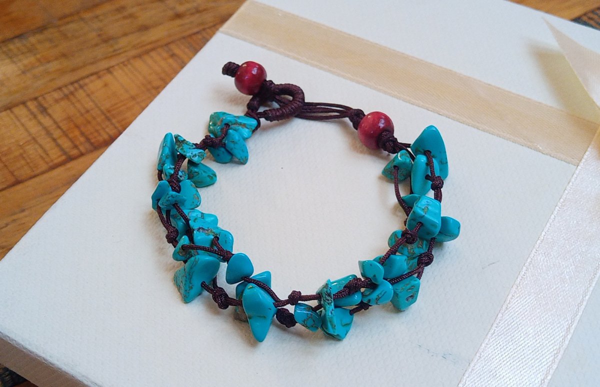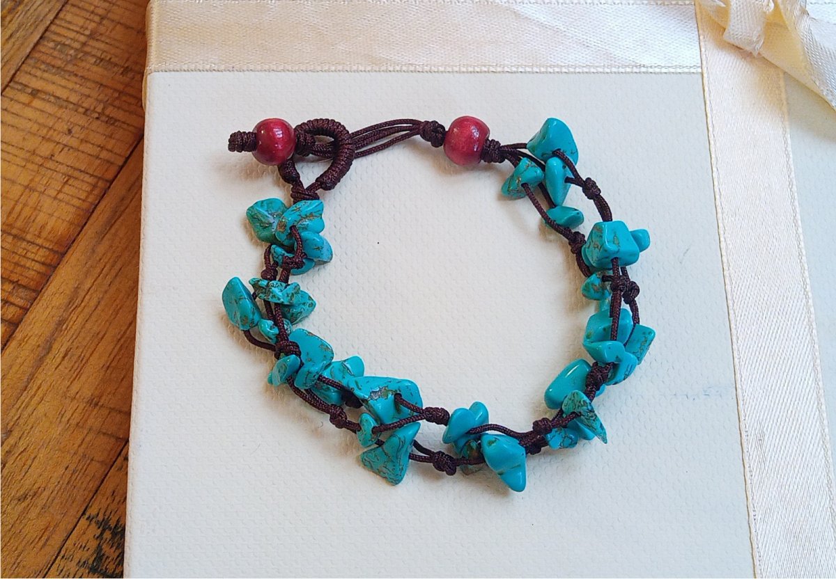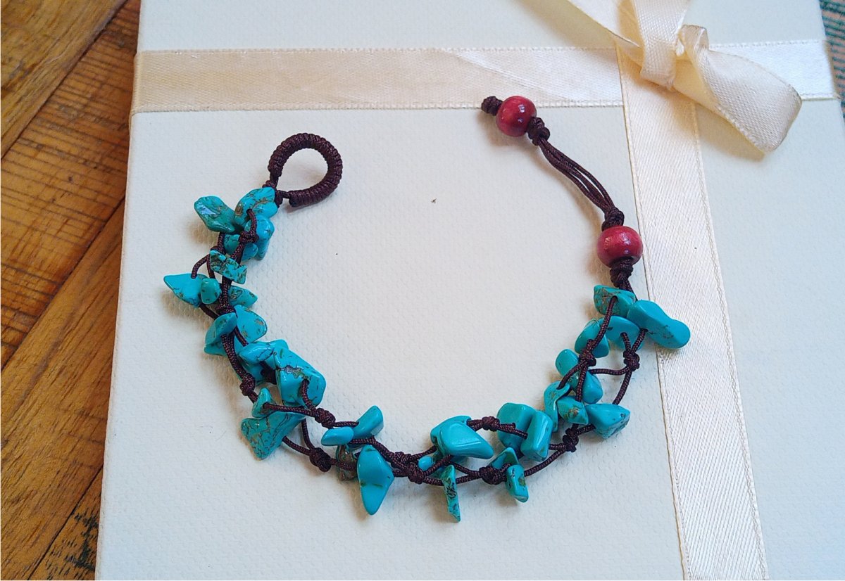 Náramek vyrobený ze zlomků tyrkysu na hnědé šňůrce stylem macramé se zapínáním přes dřevěný korálek v tmavě červené barvě