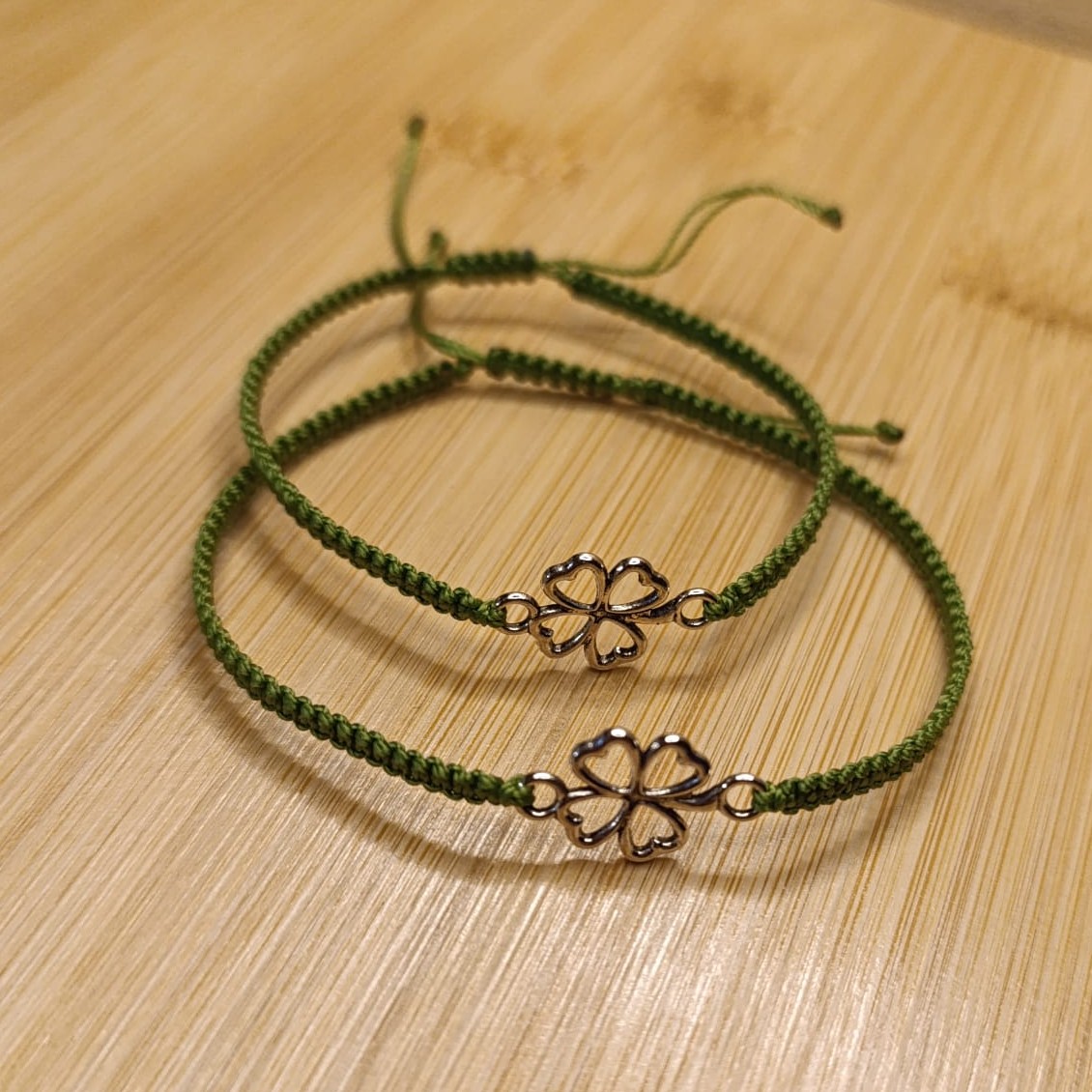 Náramky tkané technikou macramé z C-lonu odstín moss ( zelená mechová), kovový čtyřlístek.