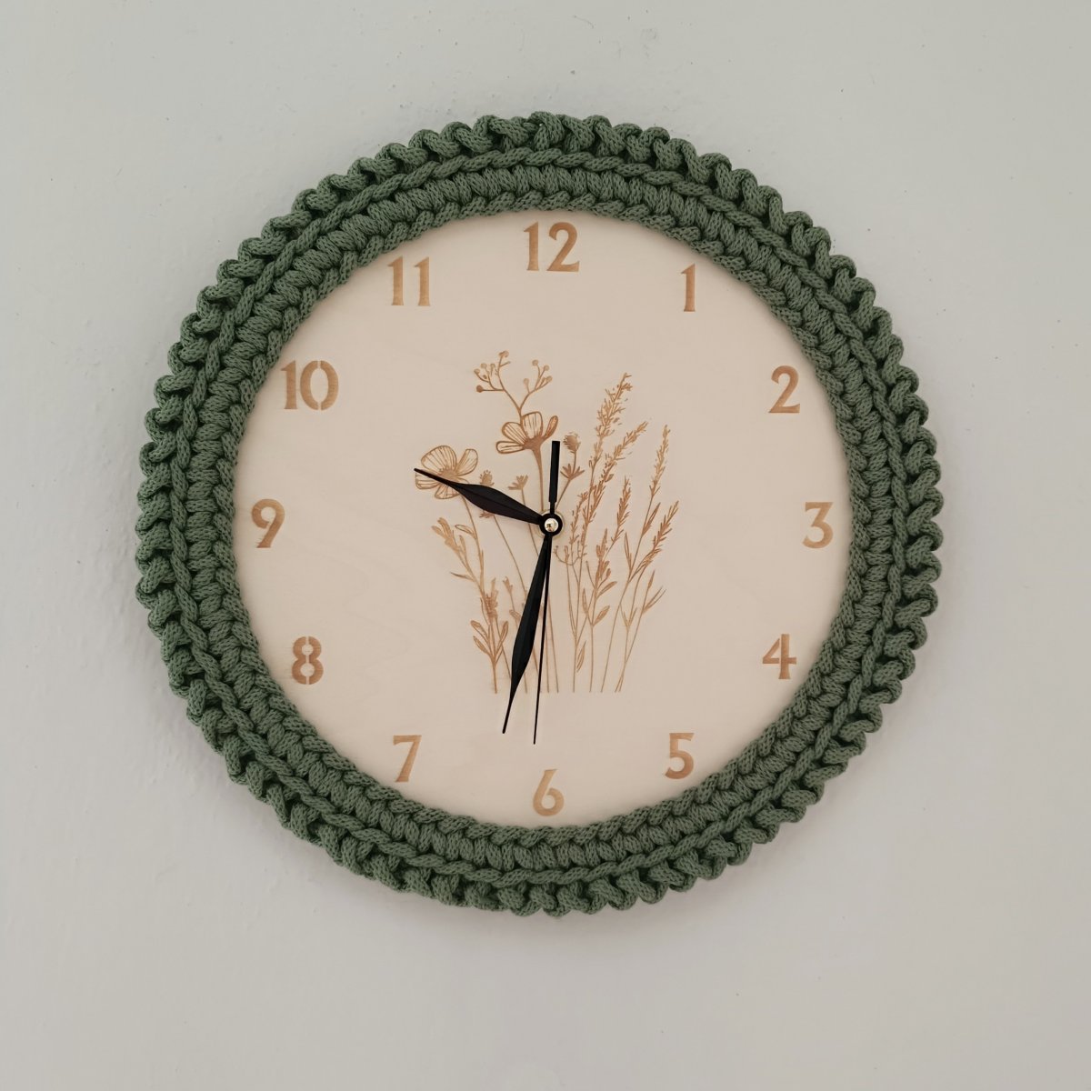 Nástěnné hodiny s lučním kvítím jsou vyrobeny z topolové překližky a 100% bavlněné šňůry, což jim dodává přírodní a jemný vzhled.