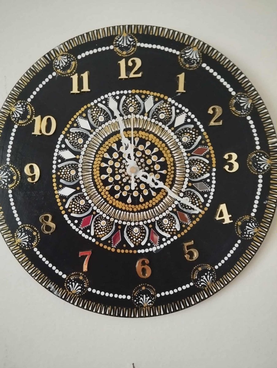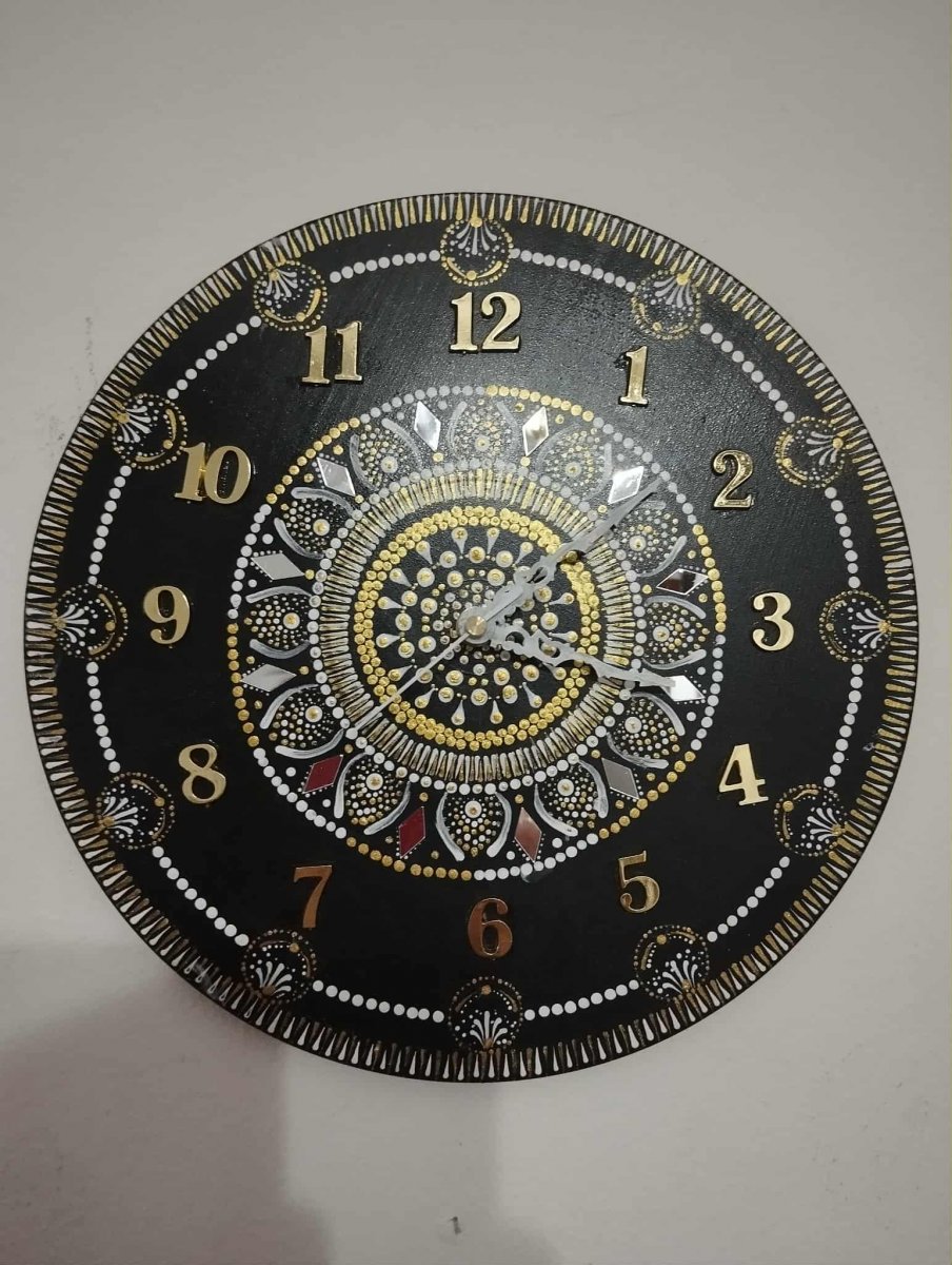 Nástěnné hodiny bílo/zlaté jsou dokonalou kombinací elegance a funkčnosti. Skvělý doplněk, který obohatí každý interiér, ať už v domácnosti nebo v kanceláři. Malováno akrylovými barvami , použity skleněné sklíčka .