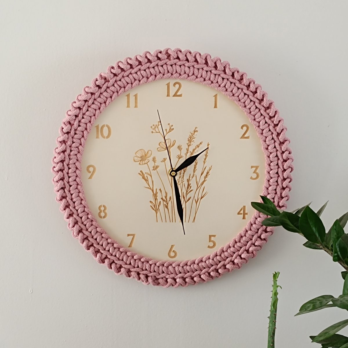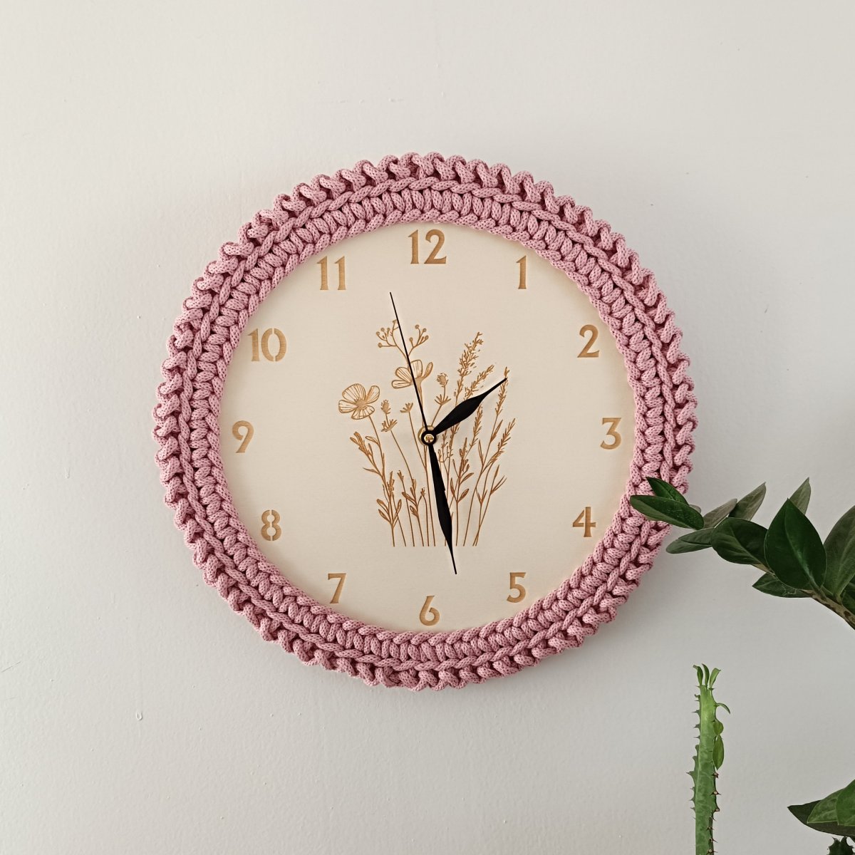 Nástěnné hodiny s lučním kvítím jsou vyrobeny z topolové překližky a 100% bavlněné šňůry, což jim dodává přírodní a jemný vzhled.