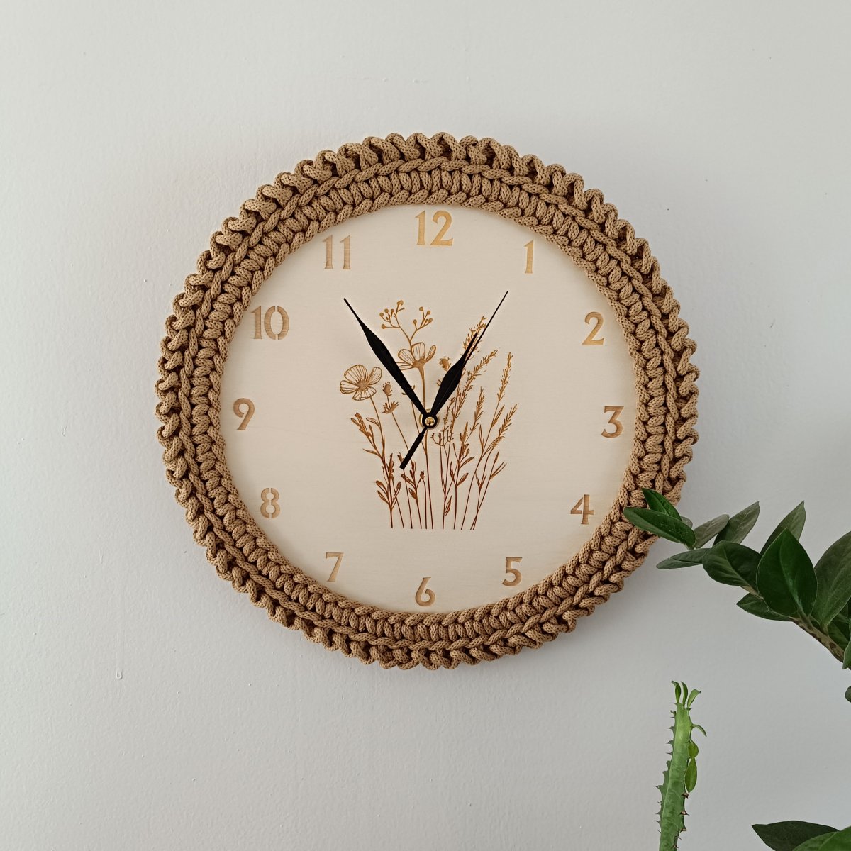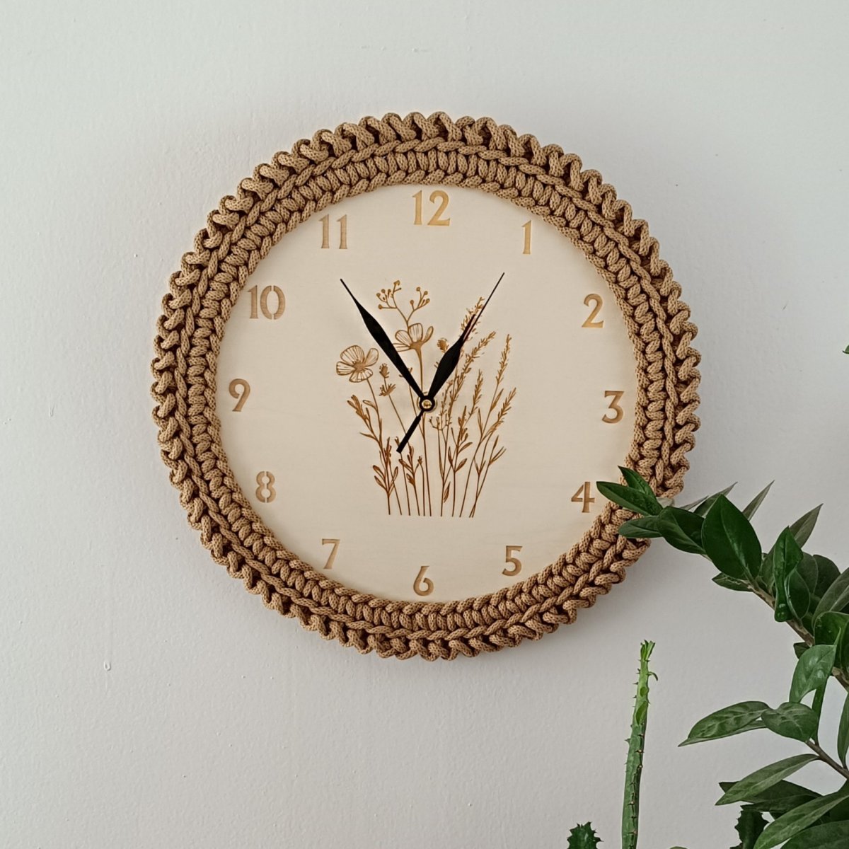 Nástěnné hodiny s lučním kvítím jsou vyrobeny z topolové překližky a 100% bavlněné šňůry, což jim dodává přírodní a jemný vzhled.