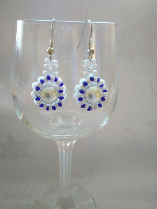 Náušnice šité. Bílé perličky obšité bílým a modrým rokajlem. Výška cca 3 cm bez háčku. Dodáváme se zarážkami.