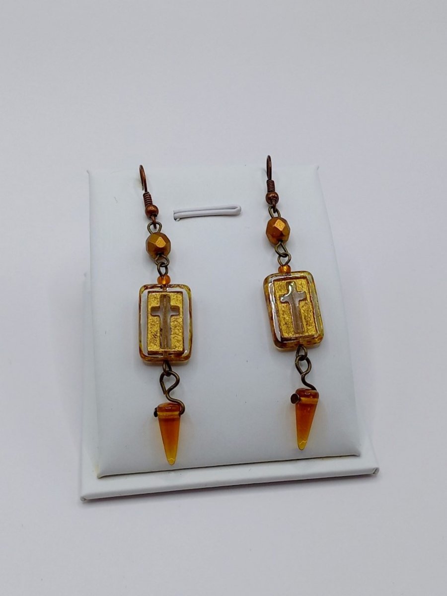 Ústředním prvkem je skleněný korálek ve tvaru ploškovaného obdélníku v medové barvě, pozlacený a vyrytý motivem kříže. Zakončení tvoří medový korálek Spike, doplněný měděnými komponenty a afroháčky pro pohodlné nošení.