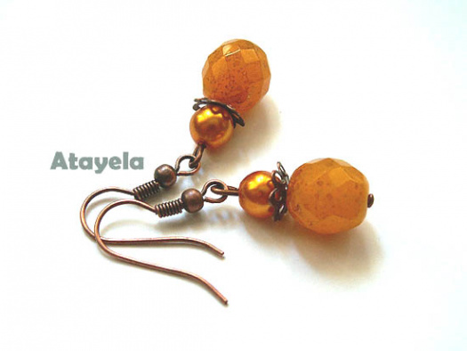 Náušnice vyrobené z ohňovek, voskovaných perlí a kovových komponentů v měděné úpravě. Délka náušnic bez háčku je 20 mm.