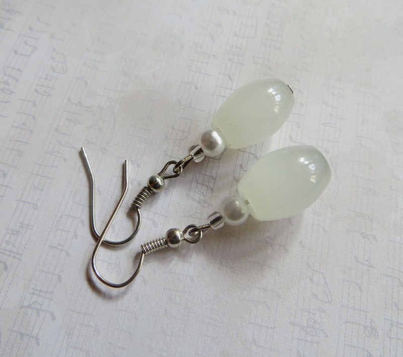 Náušnice vyrobené ze skleněných korálků - mačkaných, voskovaných a rokajlu, komponenty jsou z bižuterního kovu. Délka náušnic bez háčku je 2 cm.