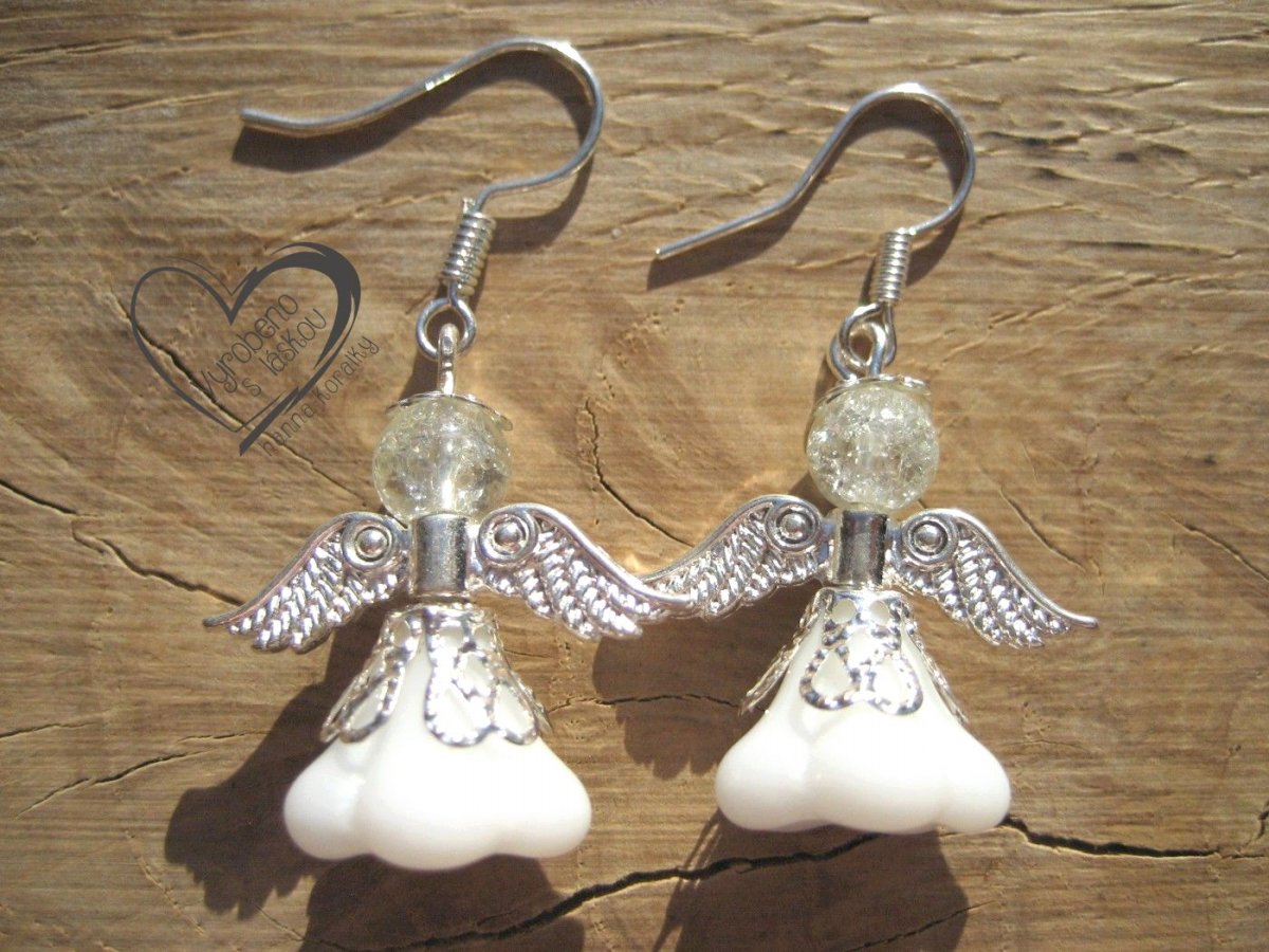 Andělské náušnice - andílci - andělíčci v kombinaci korálku v barvě - bílé, čiré a stříbrných bižuterních komponentů, délka 2,5 cm + náušnicový háček
