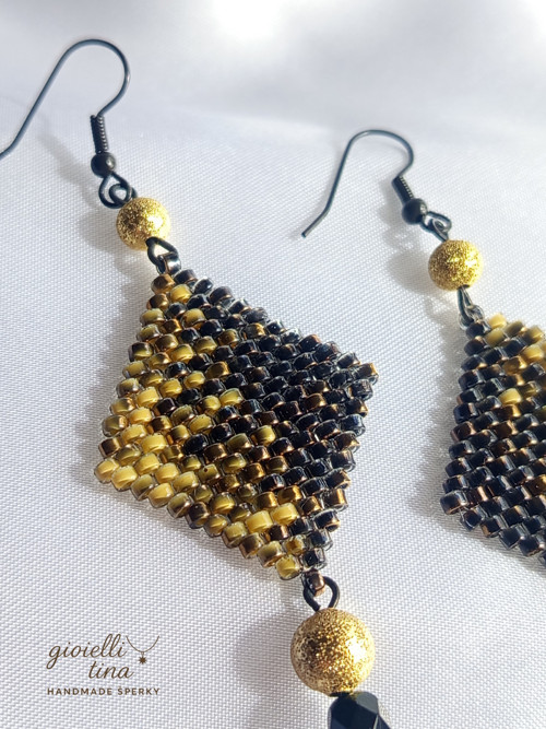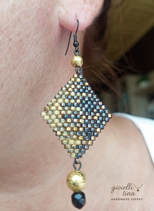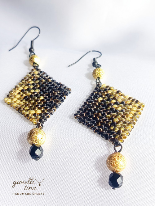 Tyto originální a elegantní náušnice jsou ručně šité z drobných korálků ve tvaru lesklého kosočtverce. Jsou utkány z drobných korálků v kombinaci lesklé zlaté a temné, elegantní černé barvy. Jejich tvar rombu dodává šperku moderní a originální vzhled. Náušnice jsou doplněny ozdobnými kuličkami se zlatými třpytkami a černým fasetovaným korálkem, což jim dodává punc luxusu a třpytivý finiš. Ideální pro večerní akce, ale i pro oživení denního outfitu.