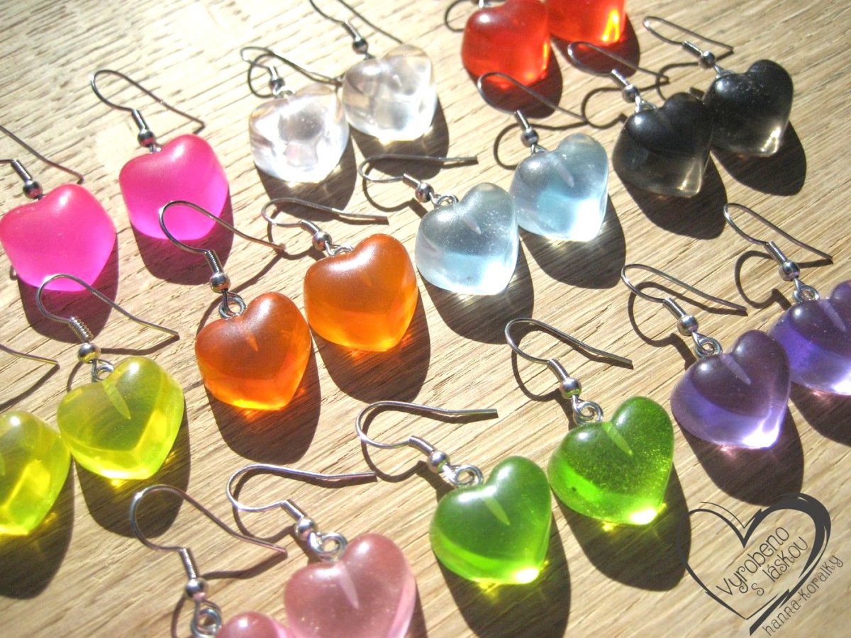 Veselé, hravé náušnice z pryskyřice - srdce - buclaté srdíčka v 10 barvách - jasně růžová, bílá, jasně oranžová, žlutá, oranžová, světle modrá, černá, světle růžová, zelená, fialová - délka náušnic 3,3 cm včetně náuš. háčku z nerez oceli, uvedená cena je za jeden pár náušnic, do poznámky uveďte vybranou barvu