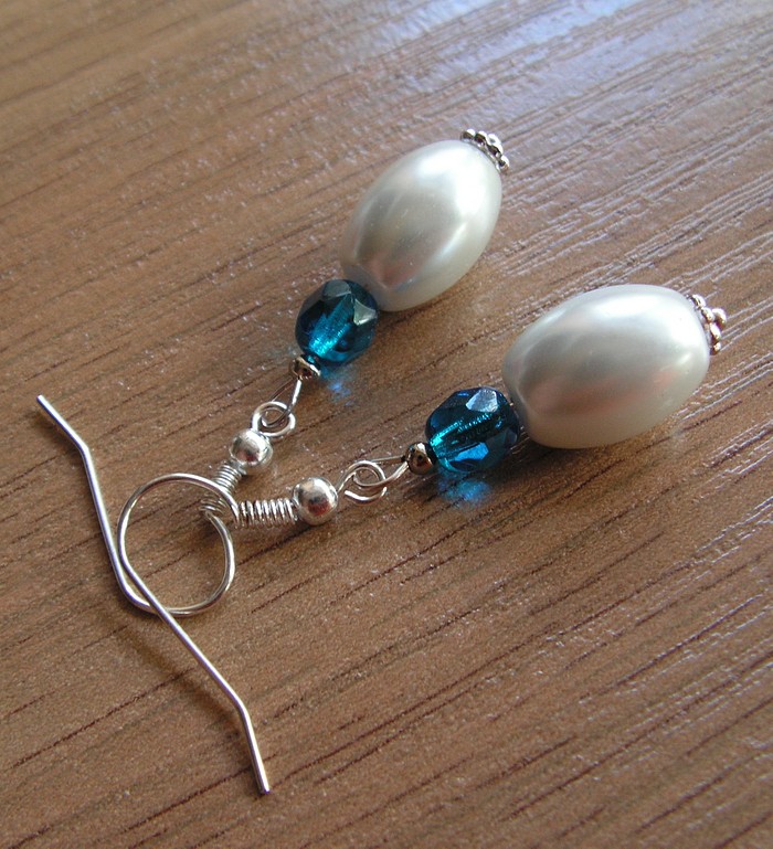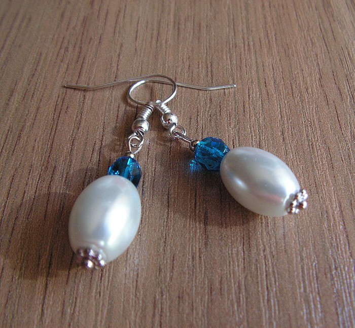 Náušnice vyrobené ze skleněných voskovaných korálků, broušených korálků - ohňovek - a komponentů z bižuterního kovu. Délka náušnic bez háčku je 2,5 cm.