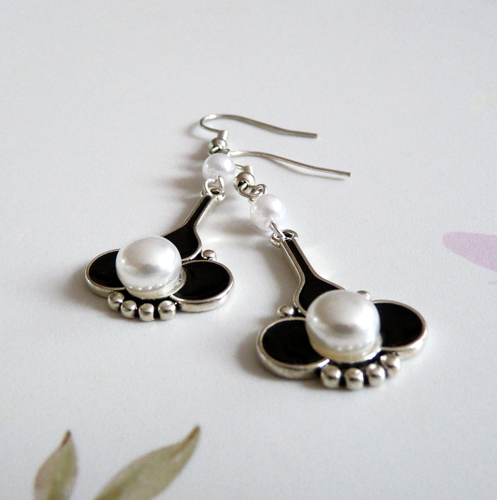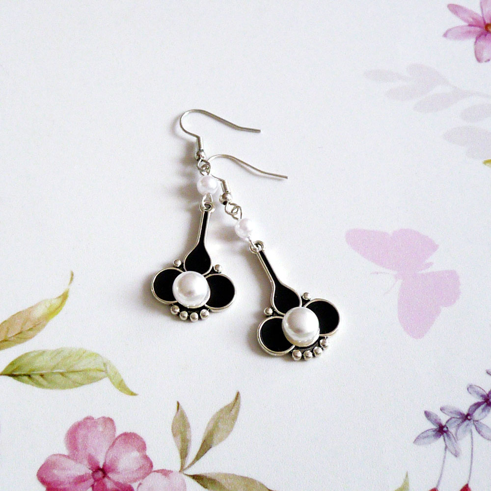 Elegantní delší náušnice s květinovým černým přívěskem s vlepenou perličkou