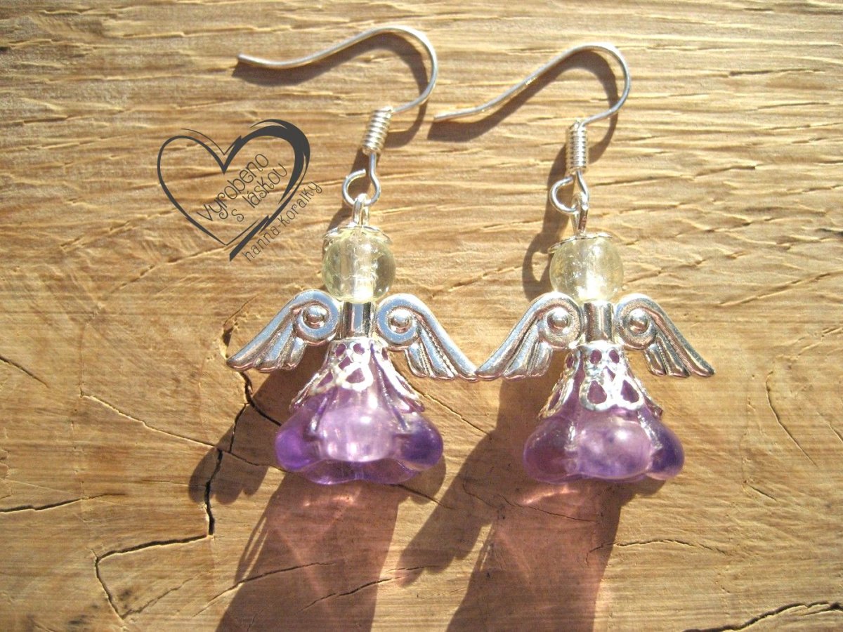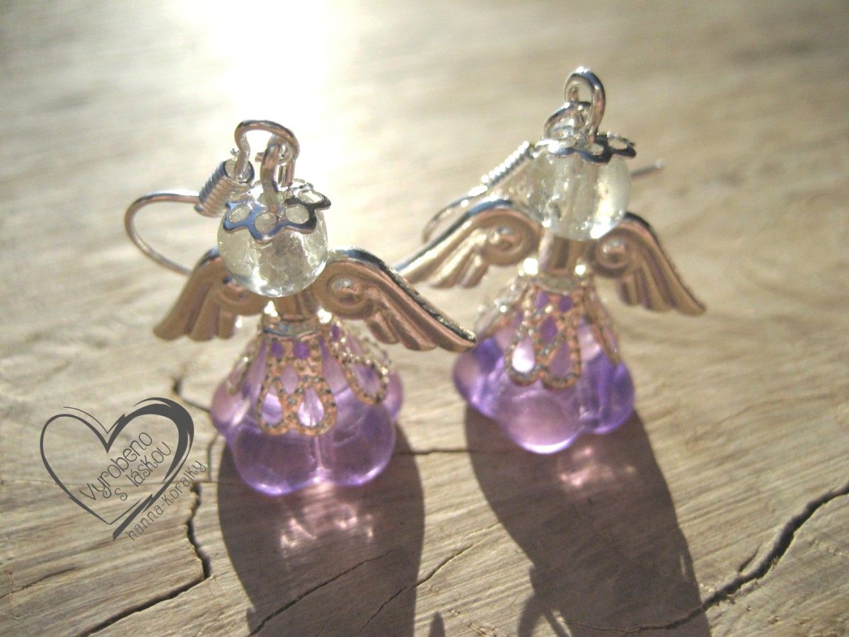 Andělské náušnice - andílci - andělíčci v kombinaci korálku v barvě - fialové, čiré a stříbrných bižuterních komponentů, délka 2,5 cm + náušnicový háček