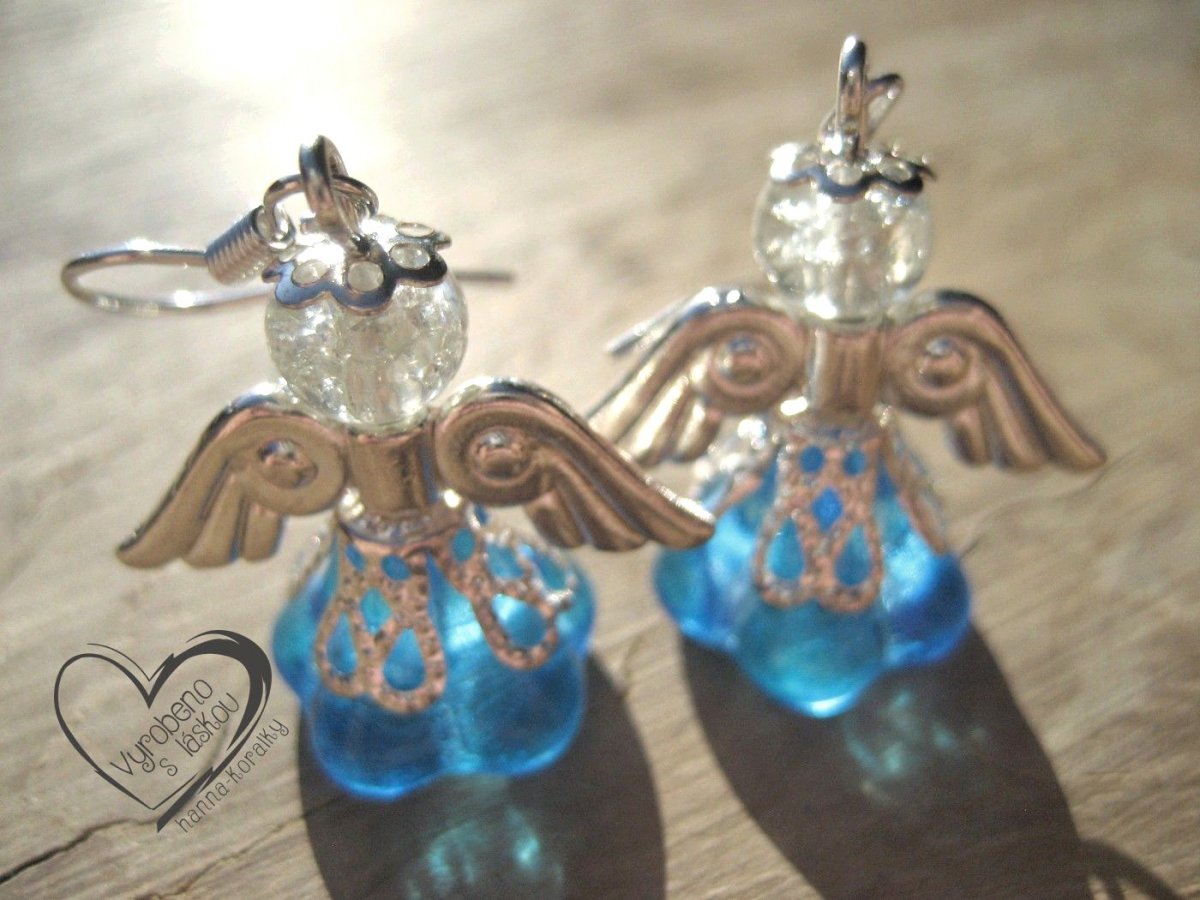 Andělské náušnice - andílci - andělíčci v kombinaci korálku v barvě - tyrkysové, čiré a stříbrných bižuterních komponentů, délka 2,5 cm + náušnicový háček