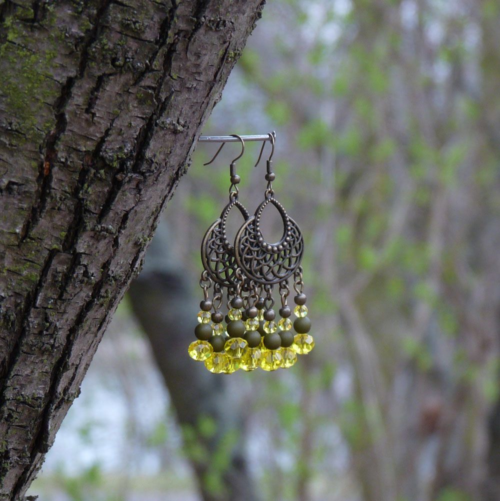 Tvoří je ozdobné ramínko, na kterém jsou závěsy tvořené broušenými žlutými korálky dvou velikostí, dřevěnými korálky v barvě khaki a kovovými bronzovými kuličkami