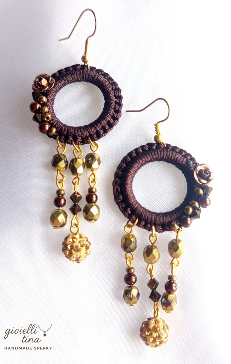 Tyto elegantní ručně vyráběné náušnice se vyznačují kruhovým tvarem obaleným tmavě hnědou voskovou šňůrkou , která jim dodává příjemnou texturu. Kruhy jsou ozdobeny drobnými kovovými růžemi a shluky korálků. Pod nimi visí kaskáda zlatavých a bronzových- hnědých korálků různých tvarů a velikostí, doplněná o výrazný, texturovaný zlatý korálek, který celému designu dodává luxusní a etnický nádech.