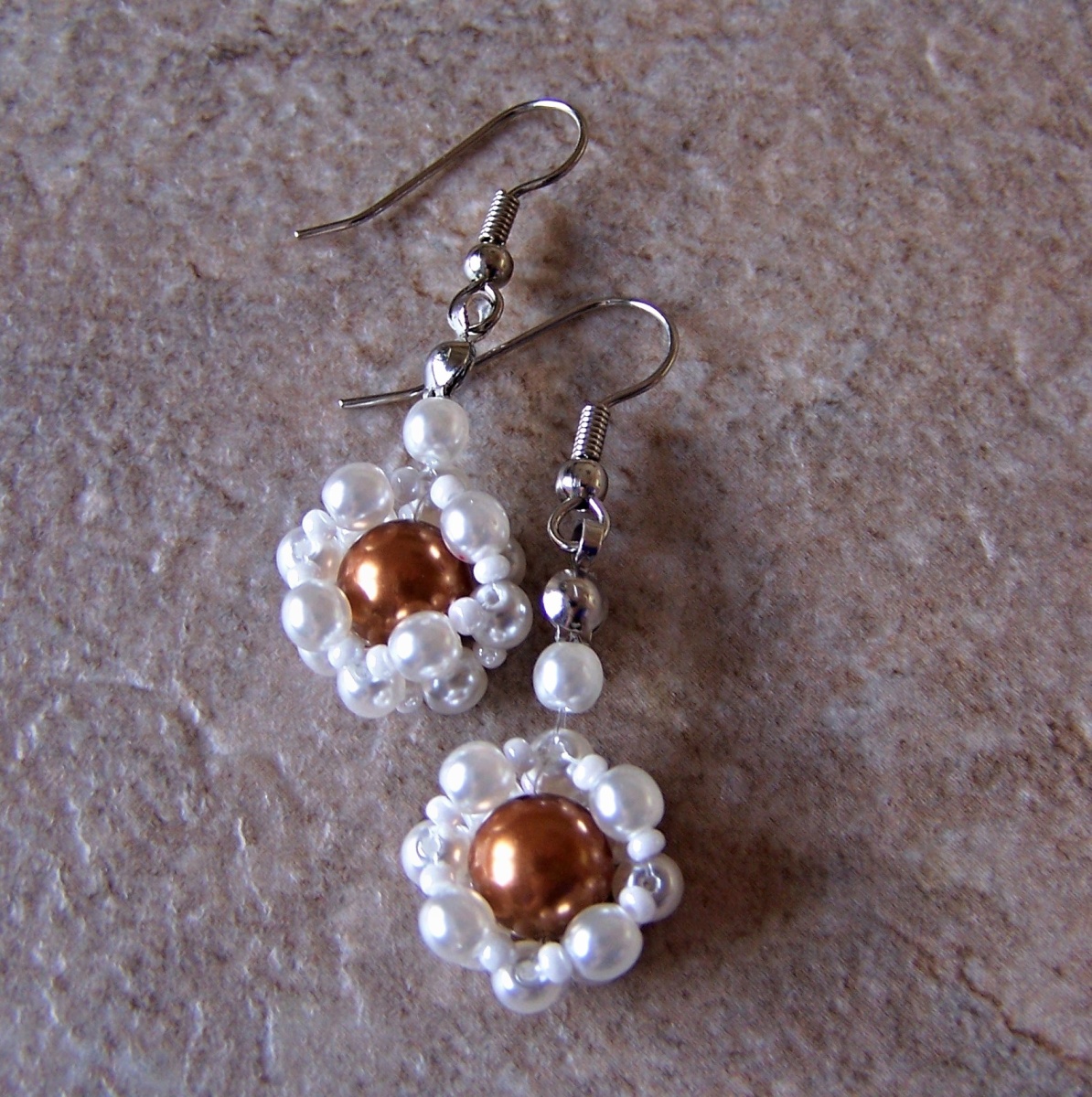 Náušnice jsou vyrobené z bílých voskových perel a z bílého, lesklého rokajlu. Střed náušnic tvoří crystal Copper pearl (SWAROVSKI Elements) - jenž vytváří dokonalou imitaci pravých perel. Vše je navlečeno na vlasci. Použité komponenty jsou platinové. Součástí náušnic jsou také silikonové zarážky.
