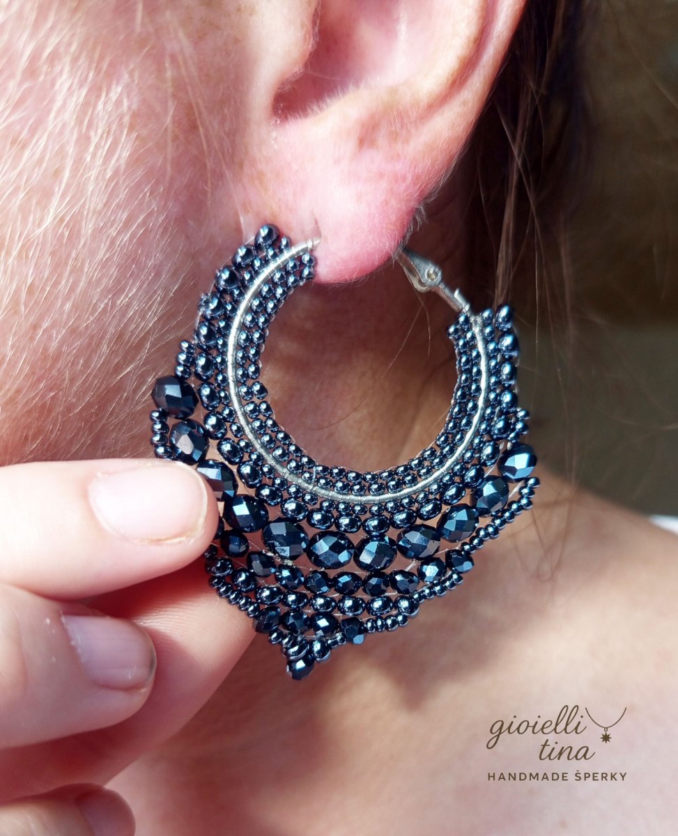 Elegantní ručně vyráběné náušnice , zdobené drobným antracitovým rokajlem a broušenými kamínky, které jim dodávají třpyt a luxusní vzhled. Tyto statement náušnice s výrazným tvarem a bohatou texturou jsou ideálním doplňkem pro ženu, která miluje originální, kvalitní a nepřehlédnutelné šperky