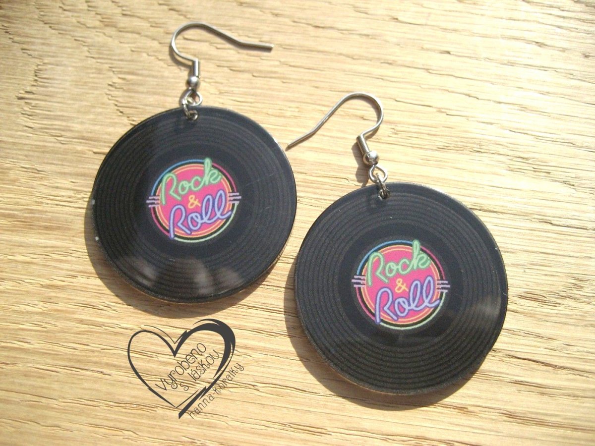 Veselé, hravé akrylové retro náušnice pro milovnice hudby a rock&rollu obzvlášť - gramofonové desky, vinyl , LP - průměr motivu 3,7 + naušnicový háček z nerez oceli