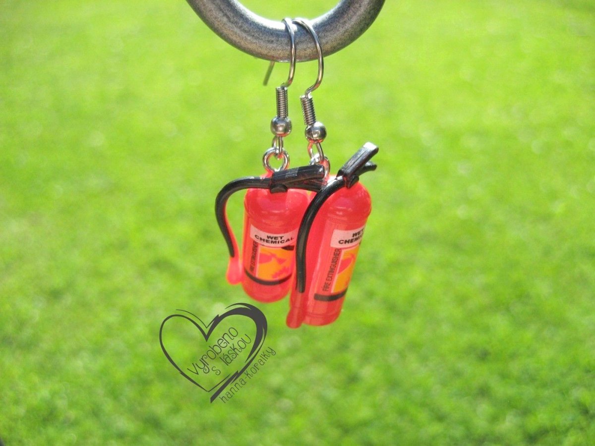 Vtipné hasičské náušnice z pryskyřice - mini hasičák - hasičský přístroj - výška motivu 2,7 cm + náušnicový háček z nerez oceli