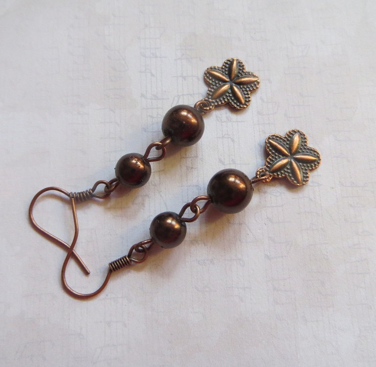 Náušnice vyrobené ze skleněných voskovaných perlí a kovových komponentů v úpravě staroměď. Délka náušnic bez háčku je 4 cm.