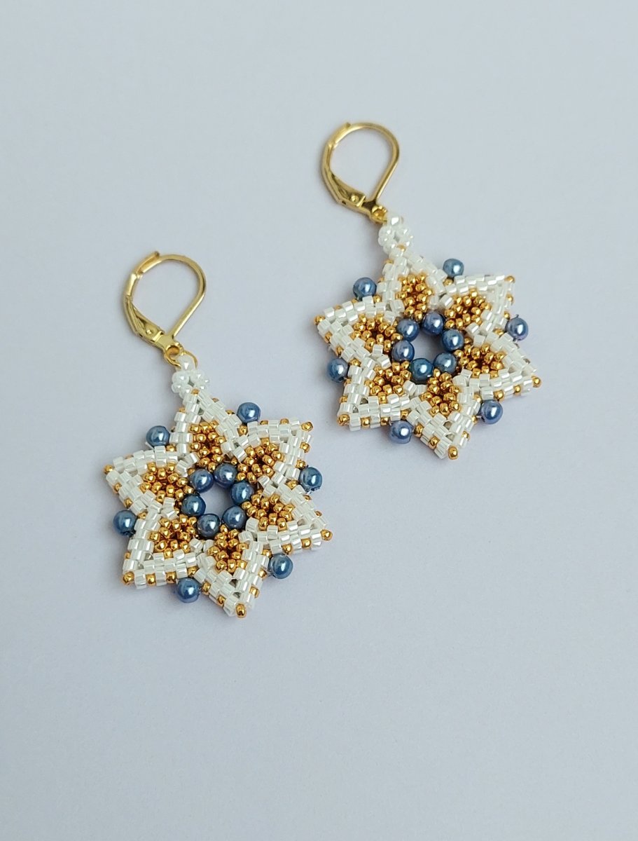 Ručně vyrobené náušnice jsou jemné, elegantní a nadčasové. Jsou šité časově náročným stehem peyote a herringbone. Náušnice tvoří dvojité hvězdičky o průměru 3cm.