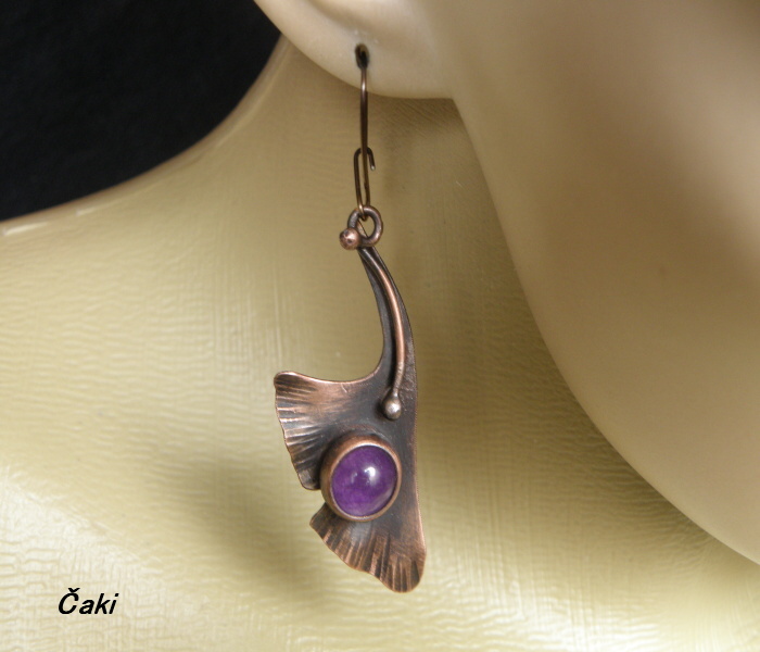 Měděné naušnice s fialkovým jadeitem vel. 10 mm. Délka naušnic je 5,2 cm, šířka v nejšiřší části 2 cm. Háčky jsou ze zdravotně nezávadného drátku Osteofix, vhodné i pro alergiky.