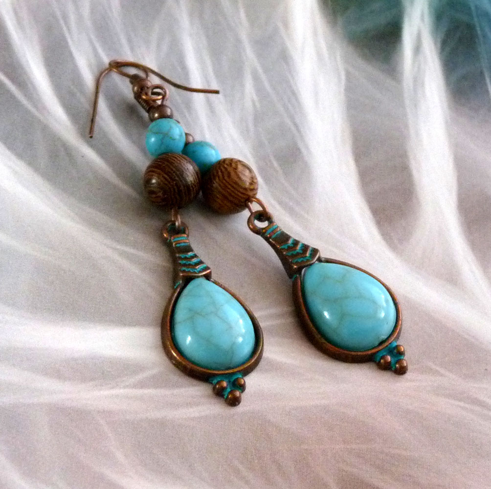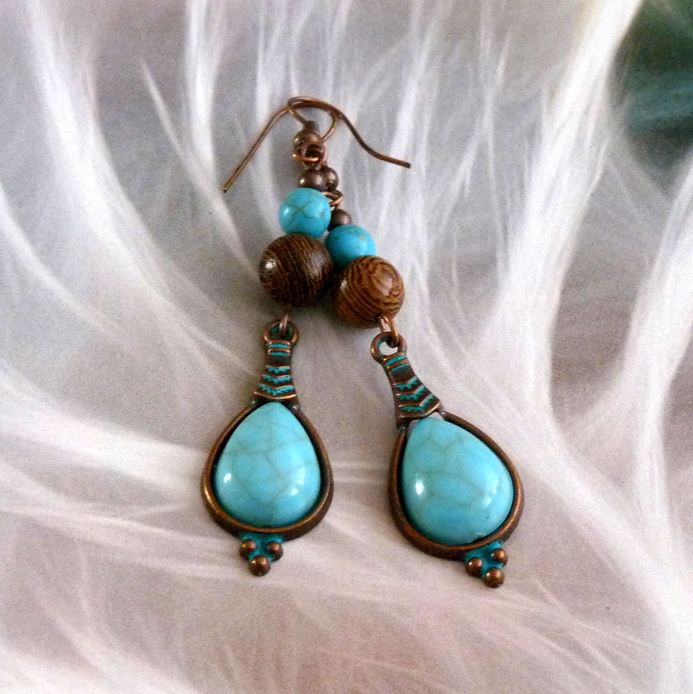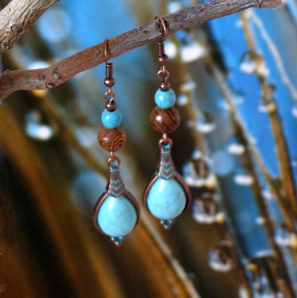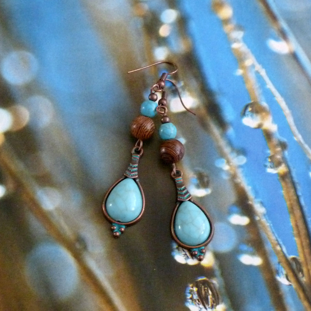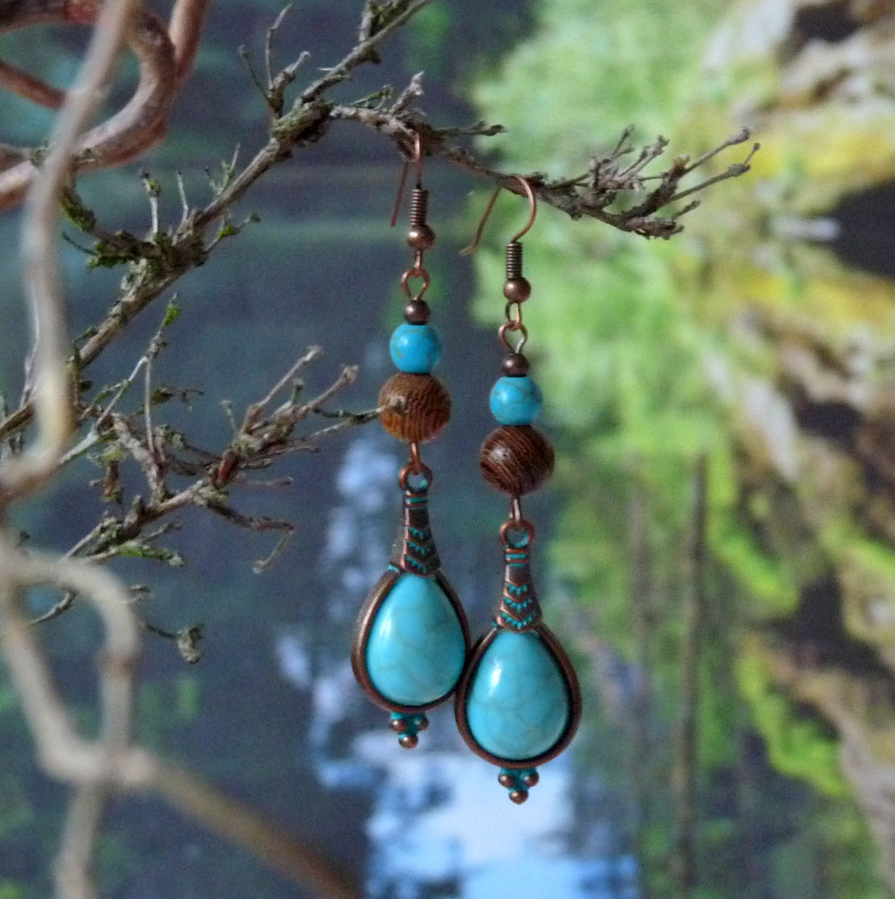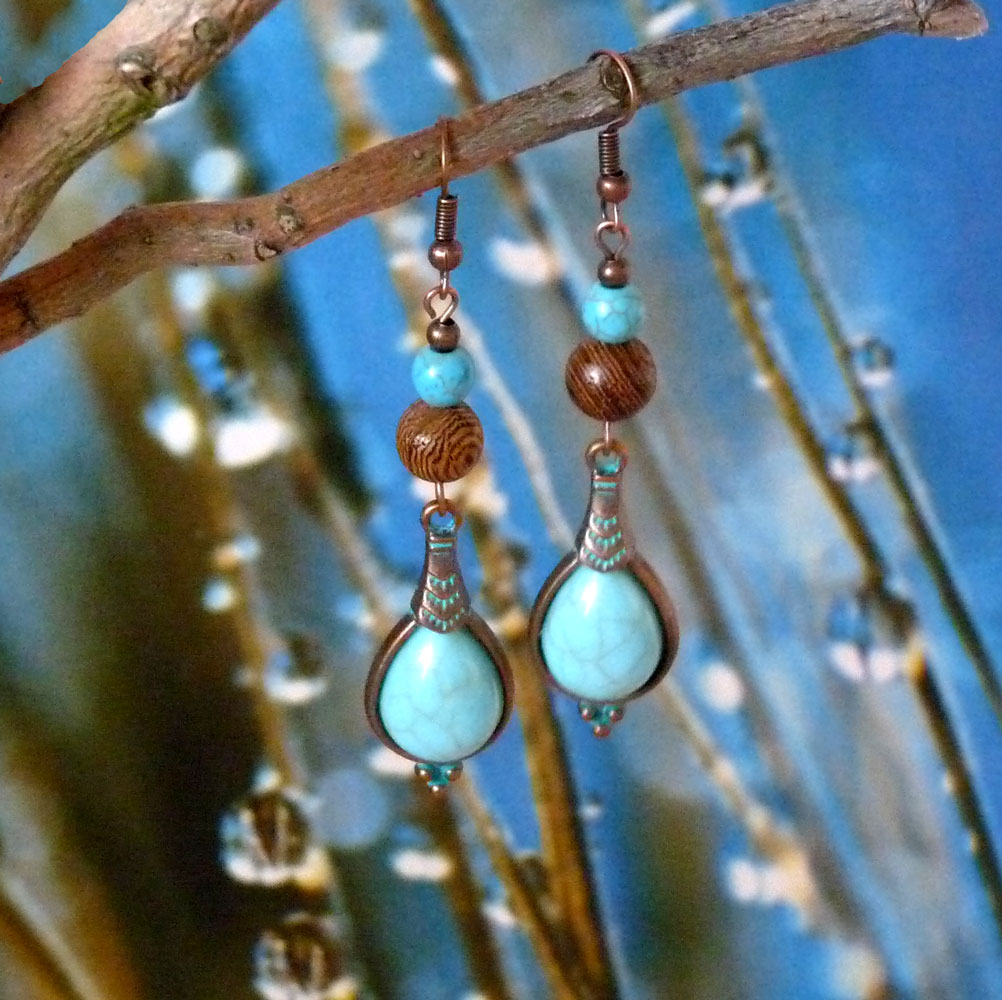 Krásný přívěsek ve tvaru kapky s vlepovaným kabošonem z tyrkenitu je ozdobený dřevěným korálkem, korálkem z tyrkenitu a kovovou kuličkou