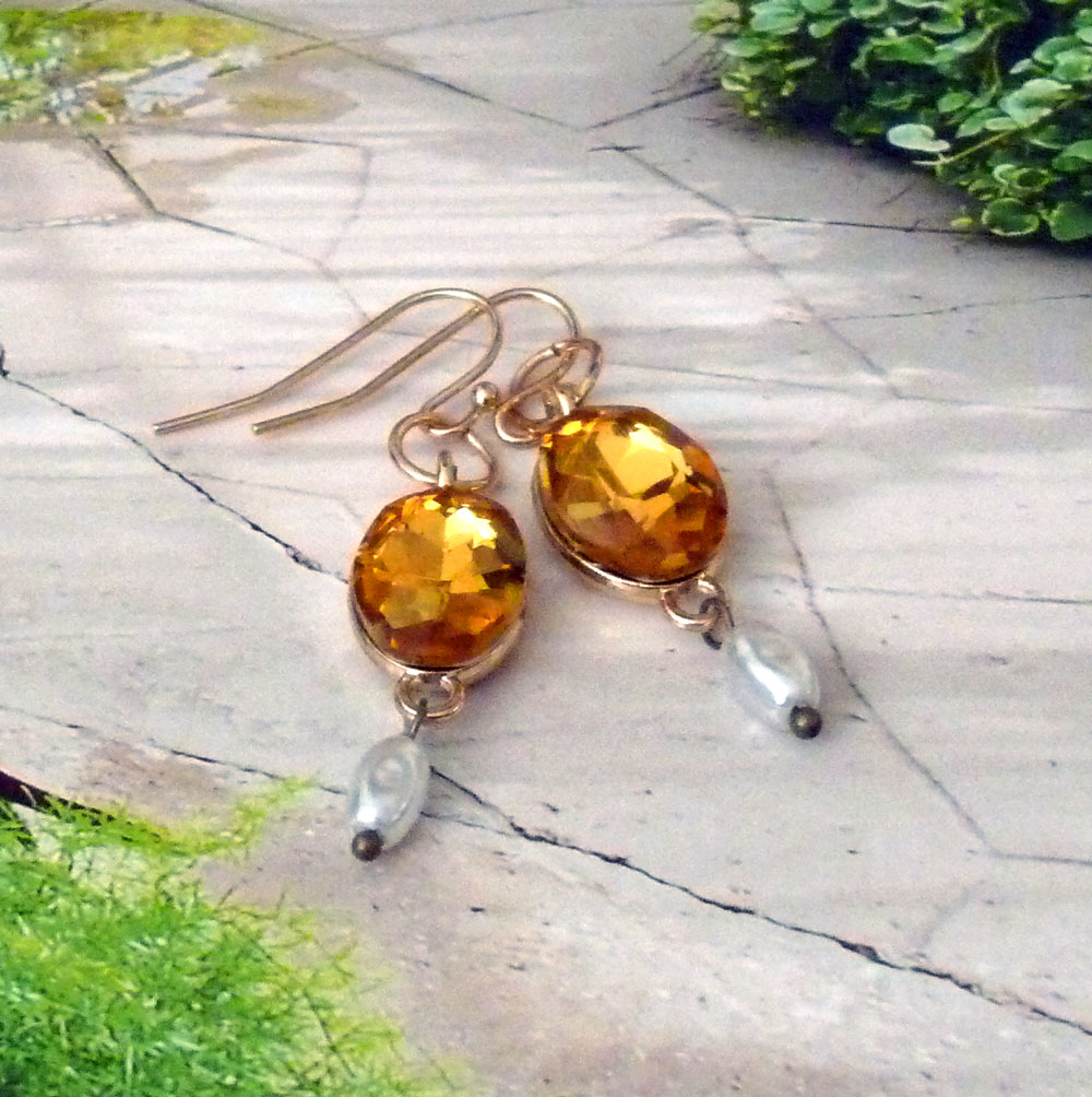 Visací náušnice s velkým broušeným kamenem v jantarové barvě