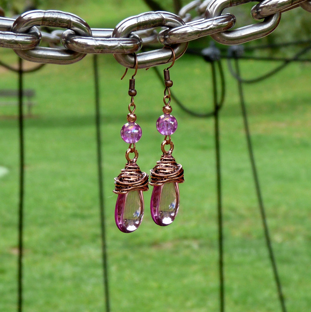 Visací delší náušnice s průhlednými kapkami ve fialové barvě