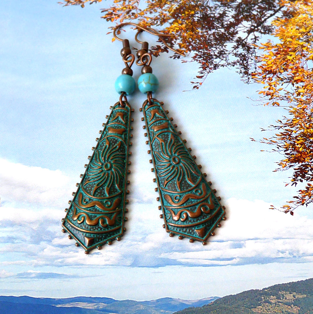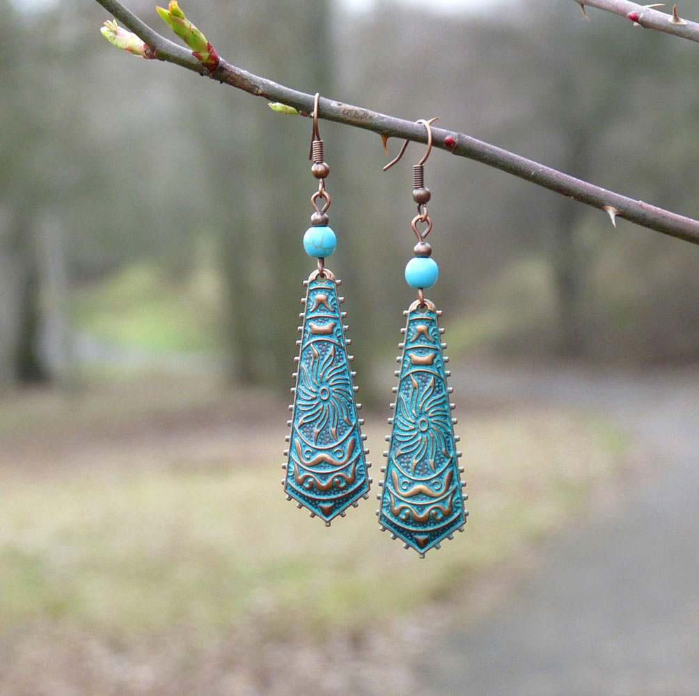 Visací náušnice s atraktivním tepaným přívěskem slunce ve stylu vintage