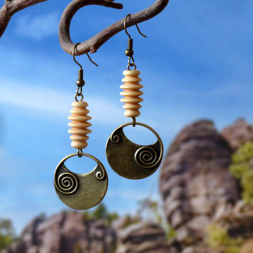 Jsou tvořeny dřevěnou přírodní vrtulkou, pod kterou je zavěšen bronzový kulatý přívěsek s tepanou spirálkou