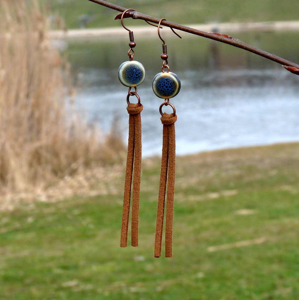 Dlouhé náušnice tvořené z kožených šňůrek a keramického korálku v modré barvě