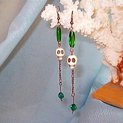 Náušničky mají na měděném řetízku lebku z minerálu tyrkys o velikosti přibližne 1 cm a tvarované skleněné korálky.