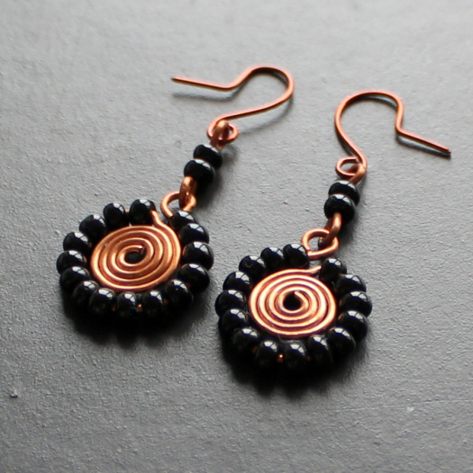 Autorské drátované náušnice ze staroměděného 1,2 mm drátu a černých rokajlových korálků. Velikost korálků cca 4 mm.