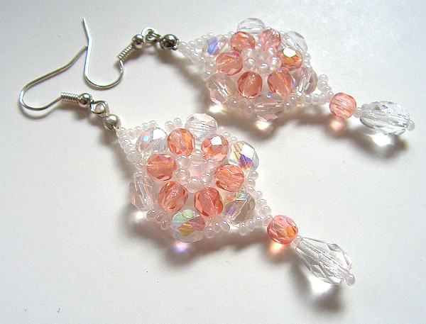 Šité náušnice vyrobené ze skleněných broušených korálků a rokajlu. Délka náušnic bez háčku je 5,5 cm.