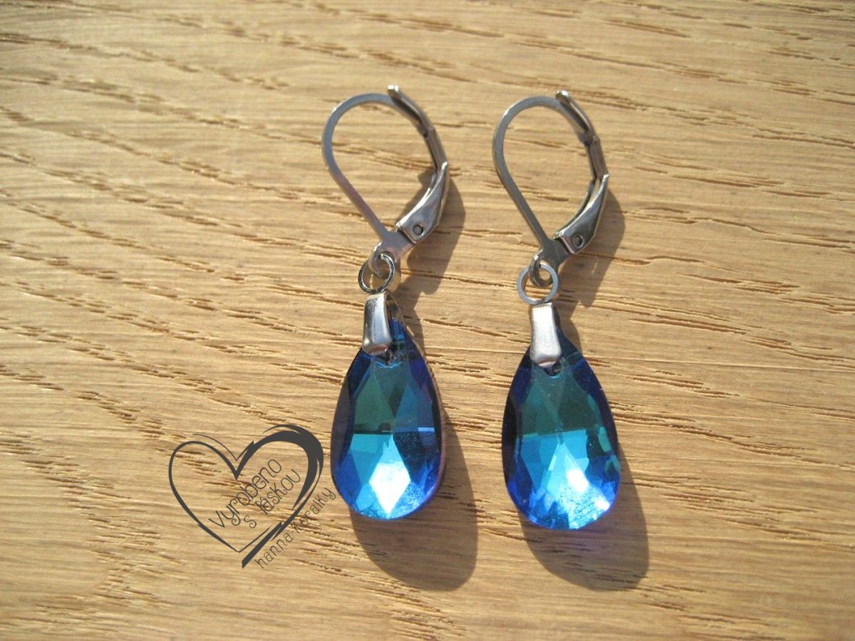Jednoduché a zároveň velmi elegantní náušnice - skleněné, fasetované kapky v modré barvě zavěšené na uzavíratelném náušnicovém háčku z nerez oceli, délka náušnic vč. háčku 3,5cm, velikost samotného přívěsku 1,5 x 1 cm.