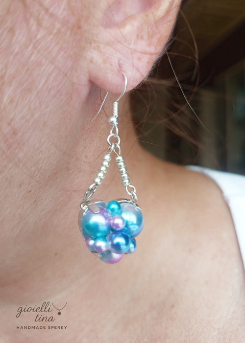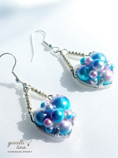 Tyto originální a hravé náušnice ve stříbrném provedení připomínají bubliny z mořské pěny. Jsou tvořeny mnoha malými perličkami v různých velikostech a odstínech světle modré, tyrkysové a růžové, které jsou poskládané do tvaru srdce. Barvy se mezi sebou prolínají a mají kovový lesk, který vytváří dojem duhových bublin. Náušnice jsou zavěšené na stříbrném háčku s ozdobným prvkem na řetízku. Jsou ideálním doplňkem pro ty, kteří milují jemné a neobvyklé šperky.